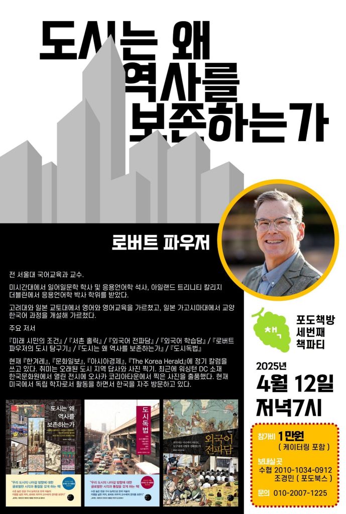 April 12, 2025: Talk on Why Do Cities Preserve History? and How to Read Cities, Podo Bookshop (포도책방), Mokpo (Korean).