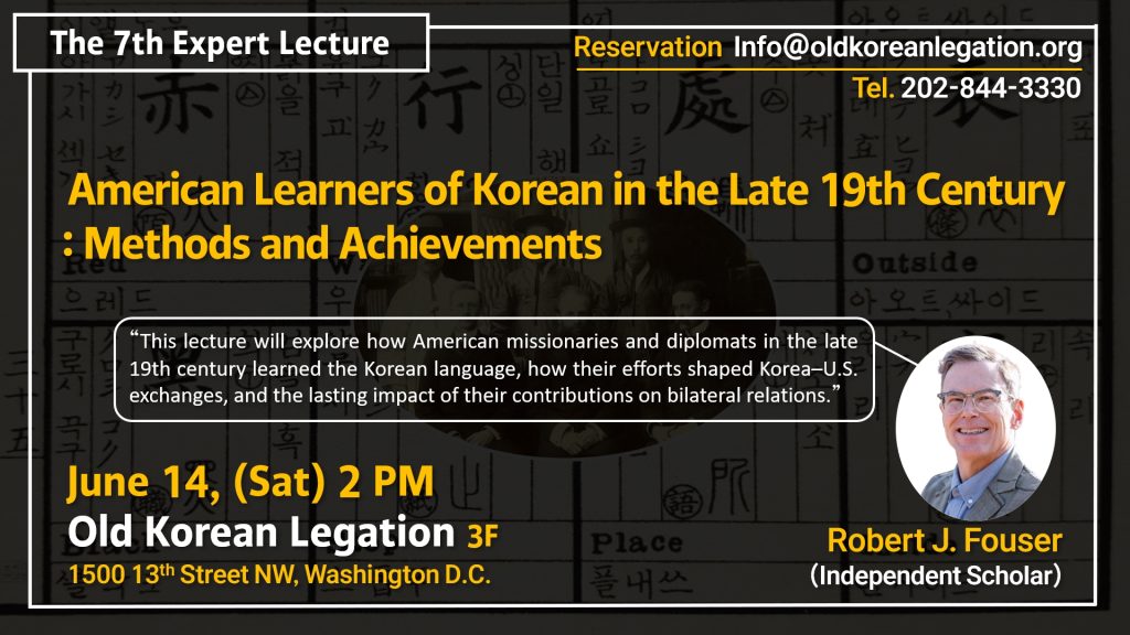 June 14, 2025: Talk titled “American Learners of Korean in the Late 19th Century: Methods and Achievements,” Old Korean Legation, Washington, D.C. (English).