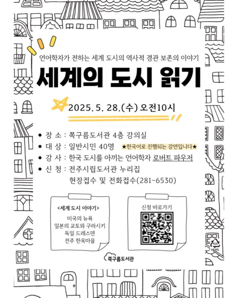 May 28, 2025: Talk on historic preservation entitled “How Cities Preserve Historic Cityscapes,” Jeonju Jjokgureum Library (쪽구름도서관), Jeonju (Korean).